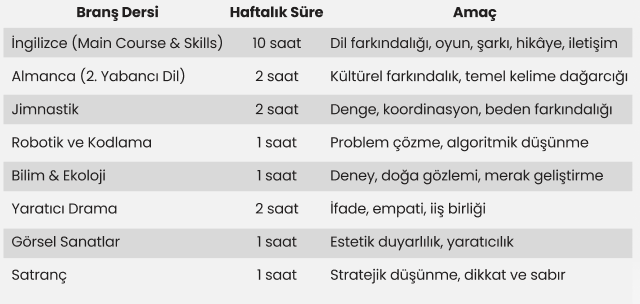Anaokulumuzda öğrenciler, sınıf öğretmenlerinin temel derslerine ek olarak haftalık branş derslerine katılırlar.